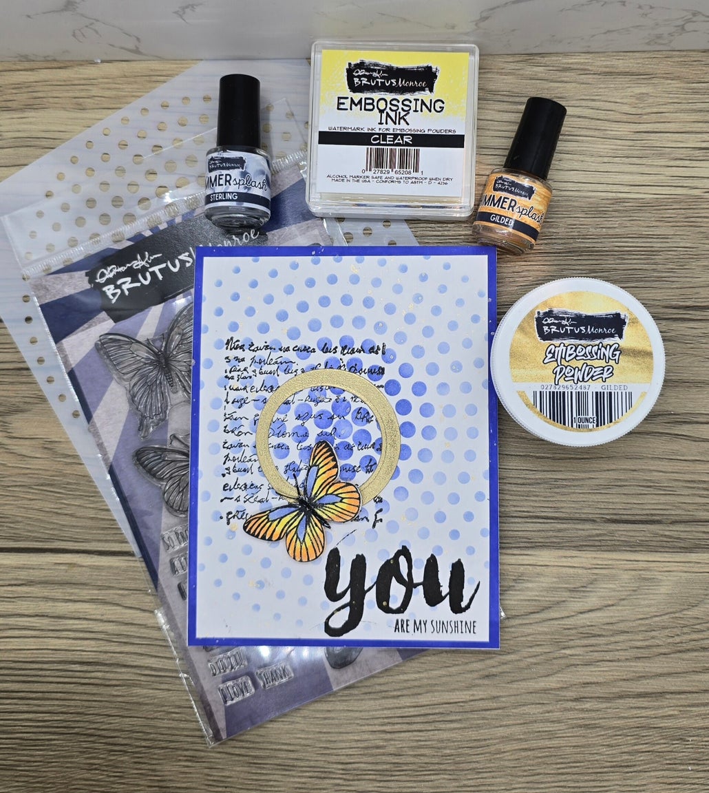 The finished product! After putting the top panel on, it looks like it is on top of an entire piece of blue cardstock. Also, I added Glossy Accents to the butterfly body and Shimmer Splash to the wings. There's a lot of shine and texture. To tie in the gold, I splattered the entire card with Gilded Shimmer Splash. Then, I stamped the sentiment. I'm really enjoying working with Brutus Monroe products that I haven't used in the past!