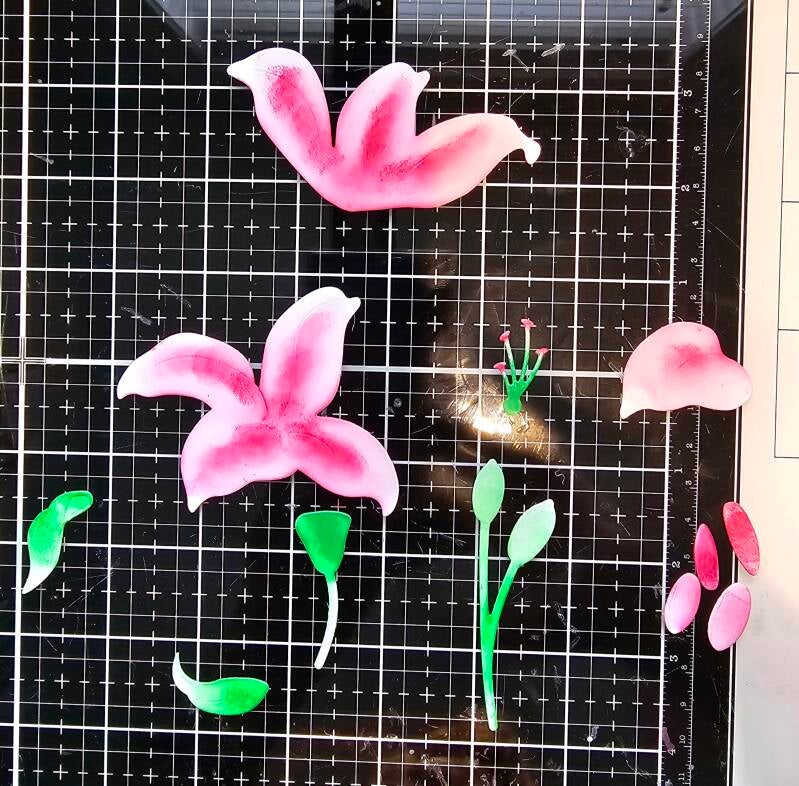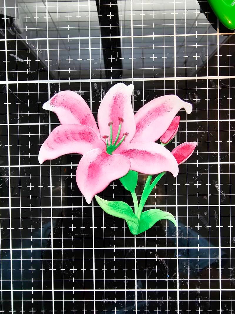 I started with the lilies. I turned them into Stargazer Lilies because they are my favorite. Starting with the lightest color firs, I used Altenew Crisp Dye Inks in Coral Berry, Ruby Red, Sweet Leaf, and Just Green. Pro tip: leave a little white on your die cut for a highlight. This makes the finished flower look more realistic and adds depth.