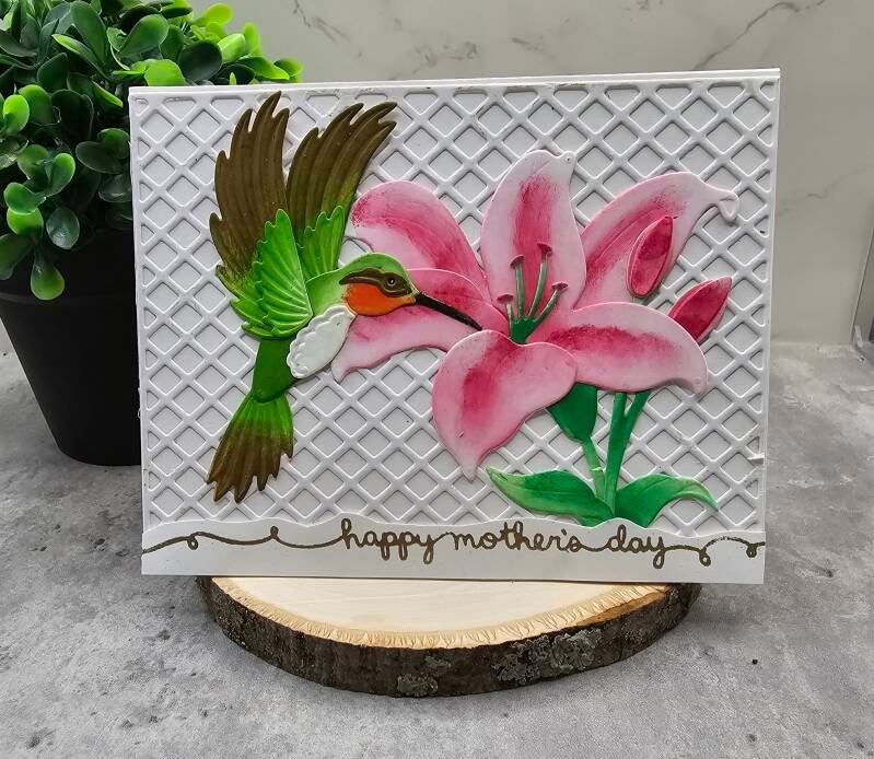 Hello, and welcome to my blog!! I'm sorry I haven't posted for a while, but I had surgery and just now feel up to it. Today, I made a Mother's Day Card for my mother-in-law, using Spellbinders, Brutus Monroe, Altenew, and Lawn Fawn products. I saw this die set and had to have it; I love hummingbirds and lilies! I'm going to guide you step-by-step how I created it.