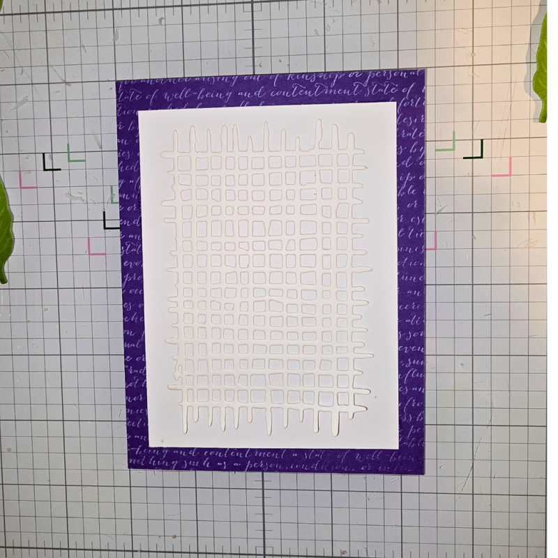 I took a piece of purple cardstock with a blue undertone for my background. This color matches the one on the flower. I added Hero Arts Script Bold Prints and their white pigment ink to add interest and texture to the panel. I had initially planned to just use a plain piece of cardstock, but it seemed to lack something. Little details like a background stamp or embossing folder can add so much to your project!