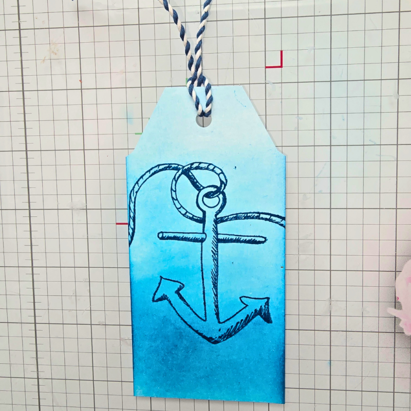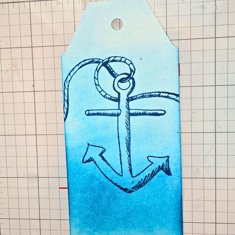 I stamped the anchor in a blue darker than any blue on the tag. The anchor is from Merry Stamper Full Plate from Blank Page Muse.